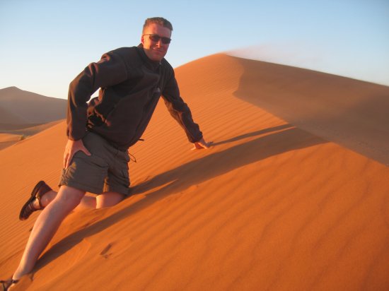 We were bracing ourselves for an even bigger dune-climb than yesterday's, but in fact there was none of that at all! We drove on to Dune 45 and when the paved road ended, continued on the sandy tracks. Foxy LOVED that and performed elegantly. We parked her just at Deadvlei lot and walked around, snapping pics of the beautiful dunes and their morning colours.